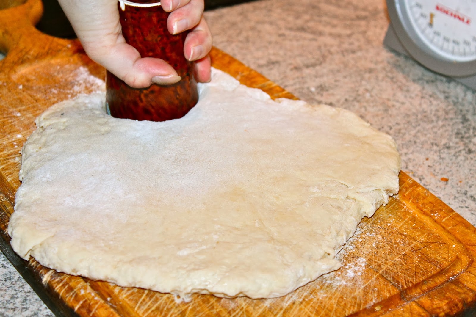 Roll the pastry about 2cm thick and cut out the scones with a round biscuit cutter (about 5cm diameter) or a glass/cup.